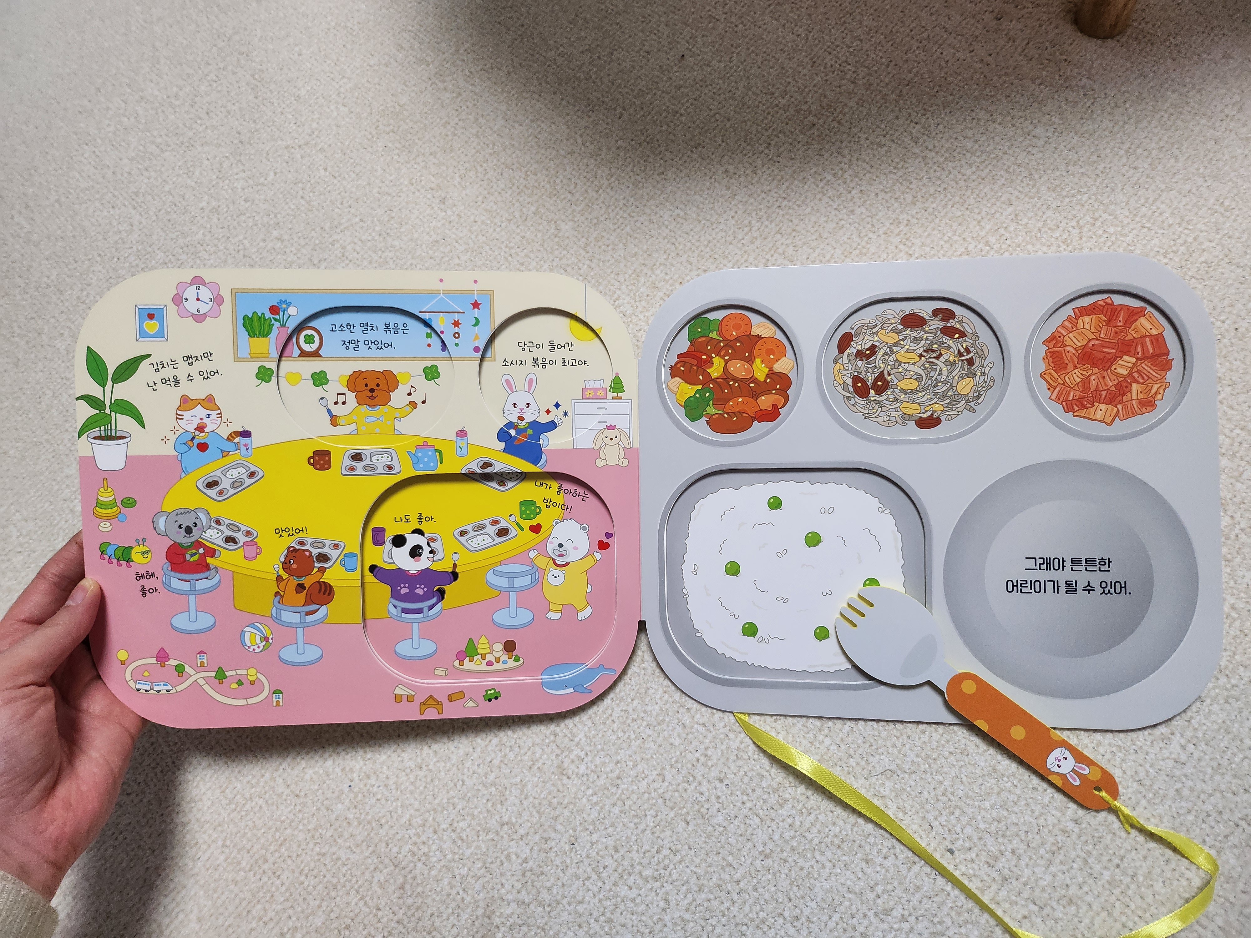 구성은 책장 넘기면 차례로 밥, 반찬들이 하나씩 생겨요. 어린이집이 배경 같은데 편식하지 않고 골고루 먹기 연습을 할 수 있을 거 같아요.